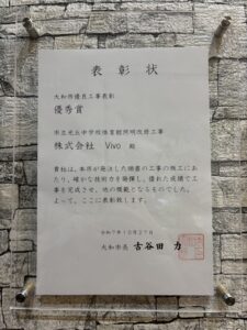 私たちが施工を担当した【市立光丘中学校体育館照明改修工事】が、この度、優良工事として評価をいただくことができ、表彰式に参列させていただきました。これもひとえに、ご協力いただいた関係者の皆様、そして現場で尽力してくれた社員の皆のおかげです。心より感謝申し上げます。