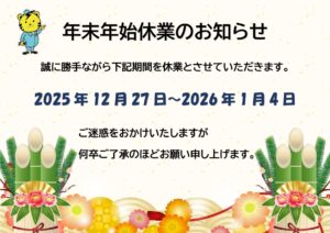 誠に勝手ではございますが、下記期間を年末年始休業とさせていただきます。